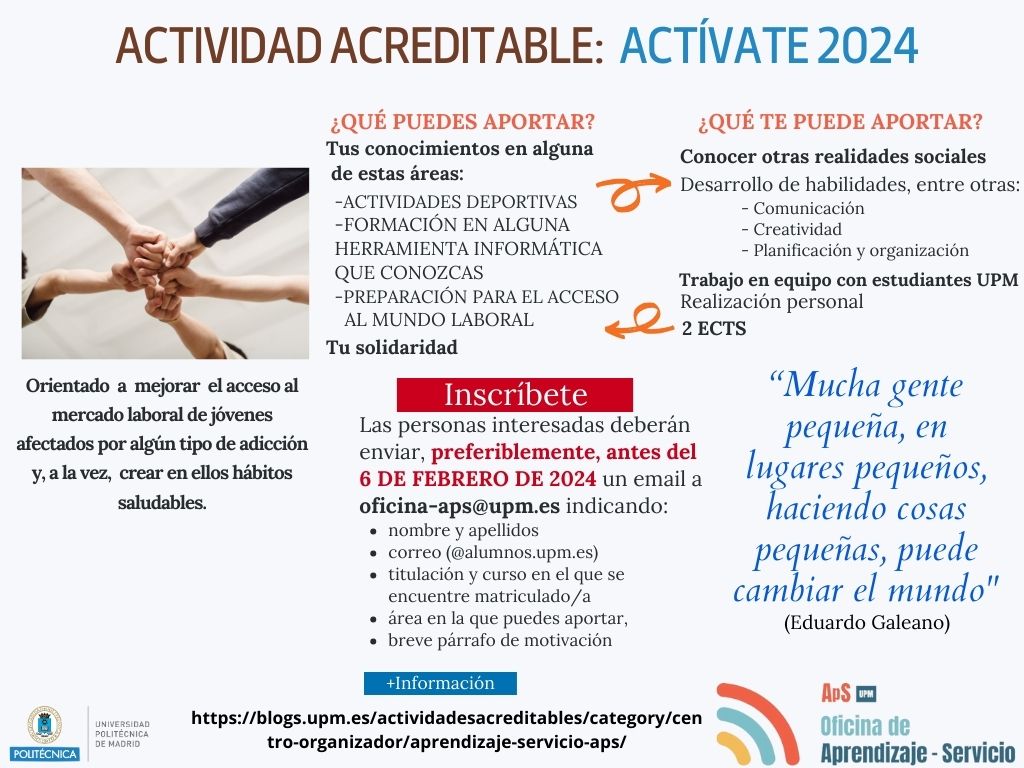 Se admiten inscripciones hasta el 6 DE FEBRERO. Si te apuntas, contribuirás con el proyecto de Aprendizaje-Servicio ACTÍVATE, centrado en la formación en ofimática y en la ayuda para mantener una vida más saludable a jóvenes en situación de riesgo. Se trabaja mano a mano con profesionales de proyecto hombre-proyecto joven.