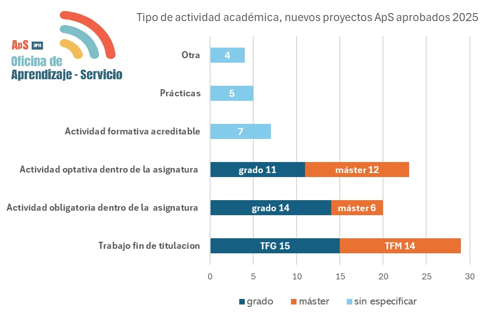 Los nuevos proyectos aprobados abordarán actividades académicas en titulaciones de grado y de de máster, actividades formativas acreditables, prácticas entre otras actividades académicas. En conjunto, el 33% de las actividades académicas se refieren a trabajos fin de titulación y un 49% son actividades integradas en asignaturas de los planes de estudios, ya sea actividades con carácter obligatorio u actividades optativas.