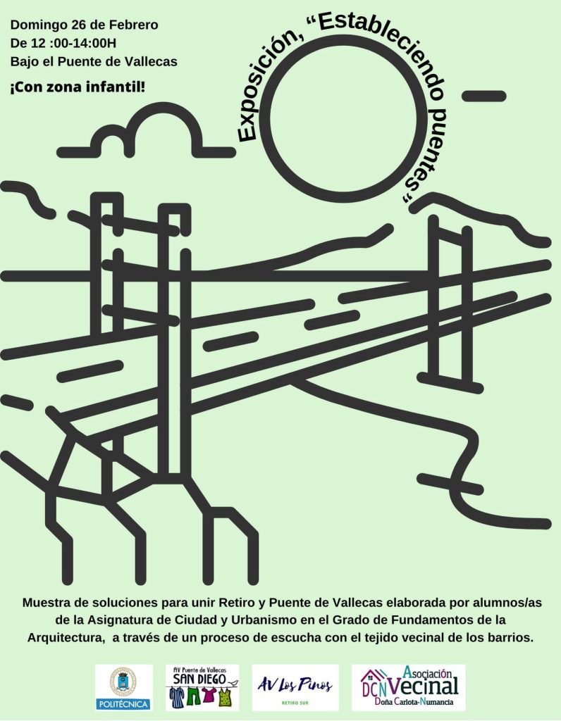 Este domingo 26 de Febrero de 12 a 14h, desde el proyecto ApS: “Estableciendo puentes entre la UPM y el tejido social y político madrileño: análisis de propuestas para reordenar el entorno del Puente de Vallecas y estudio de su posible transformación desde una perspectiva sostenibles” invitan a participar en una exposición con los trabajos realizados por estudiantes de la asignatura de Ciudad y Urbanismo dentro del Grado de Fundamentos de Arquitectura de la Universidad Politécnica de Madrid.