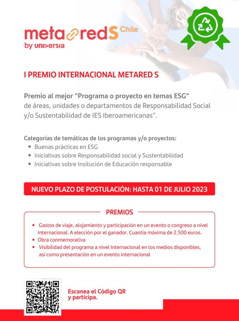 El 1er Premio Internacional MetaRed ESG tiene como objetivo promover la transferencia de conocimientos y experiencias en el ámbito de la sostenibilidad y la responsabilidad social de las Instituciones de Educación Superior (IES), y reconocer el papel de las diferentes personas involucradas en estos procesos. Con este fin, se otorgarán premios a personas involucradas en las diferentes áreas de IES / Responsabilidad Social / Sostenibilidad de las IES que participen presentando proyectos con las mejores experiencias y casos prácticos de sus instituciones en este 1er Premio Internacional.